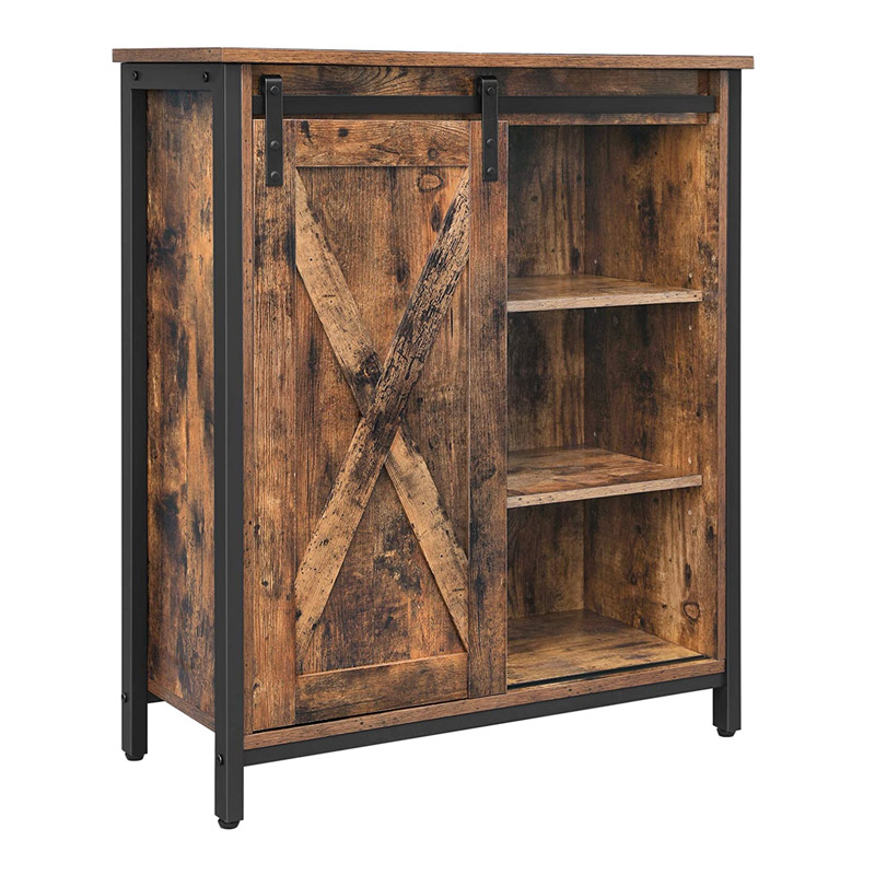 Το έπιπλο, από την εταιρία VASAGLE, διαθέτει βιομηχανικό σχεδιασμό με στιβαρό σκελετό από ατσάλι και μοριοσανίδες με ρουστίκ καφέ φινίρισμα. Διαθέτει συρόμενη πόρτα, για να μπορείτε να διαλέξετε ποια πλευρά του θα εκθέσετε και 3 ρυθμιζόμενα ράφια. Εξοπλισμένο με ρυθμιζόμενα πόδια για να προσαρμόζεται σε όλες τα δάπεδα.