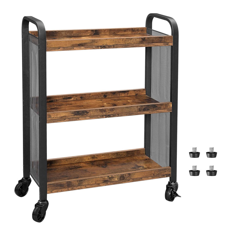 Το τρόλεϊ κουζίνας, από την εταιρία VASAGLE, διαθέτει βιομηχανικό σχεδιασμό με μεταλλικό σκελετό από ατσάλι. Έχει 3 ξύλινα και ευρύχωρα ράφια, πλευρικό πλέγμα, 4 τροχούς 2 εκ των οποίων με φρένα και ρυθμιζόμενα πόδια για να προσαρμόζεται σε όλα τα πατώματα.