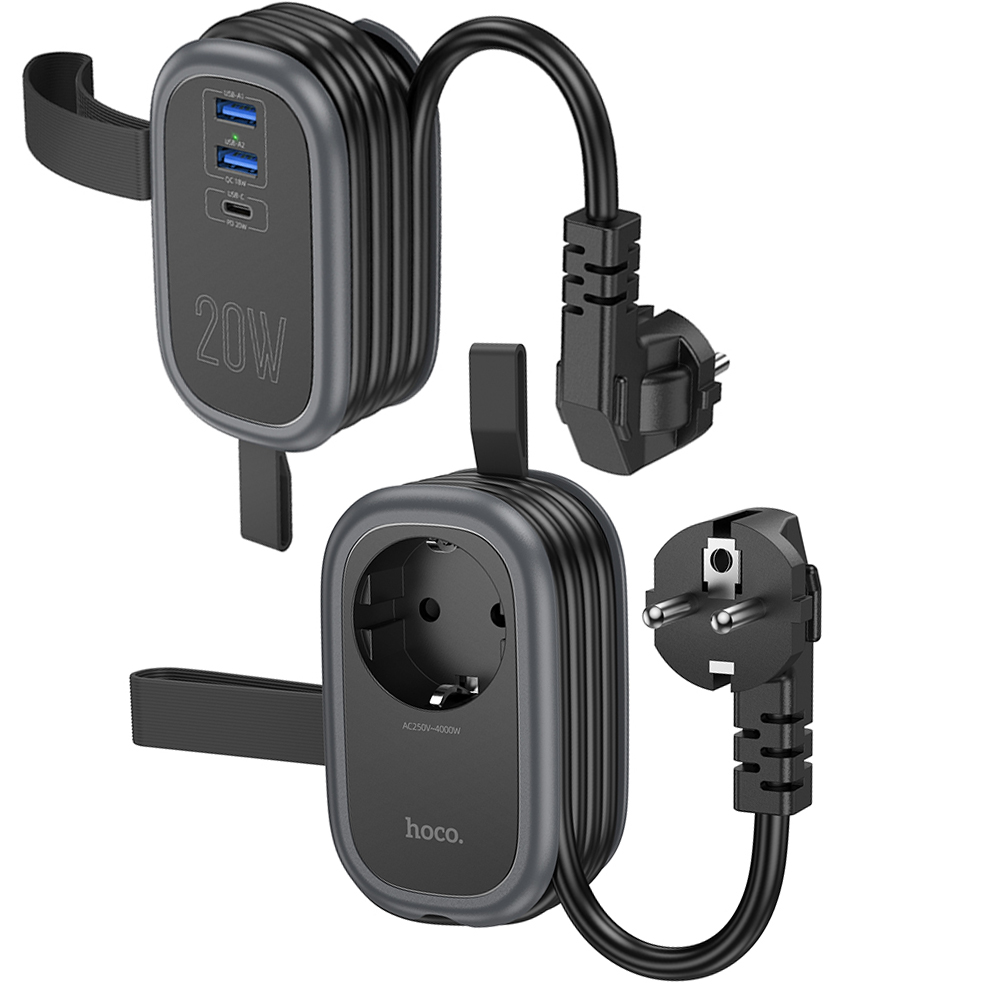 Φορτιστής Hoco NS7 Sharp με Προέκταση Πρίζας και 3 Εξόδους Φόρτισης 1xUSB-C PD20W και 2xUSB-A 18W Μαύρος