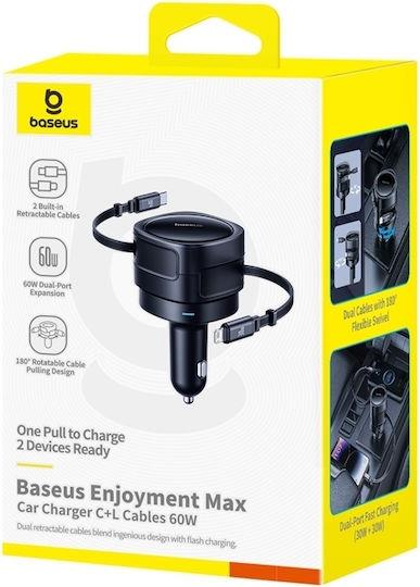 BASEUS ENJOYMENT MAX, ΦΟΡΤΙΣΤΗΣ ΑΥΤΟΚΙΝΗΤΟΥ, ΚΑΛΩΔΙΑ LIGHTNING ΚΑΙ TYPE-C, 60W, ΜΑΥΡΟ