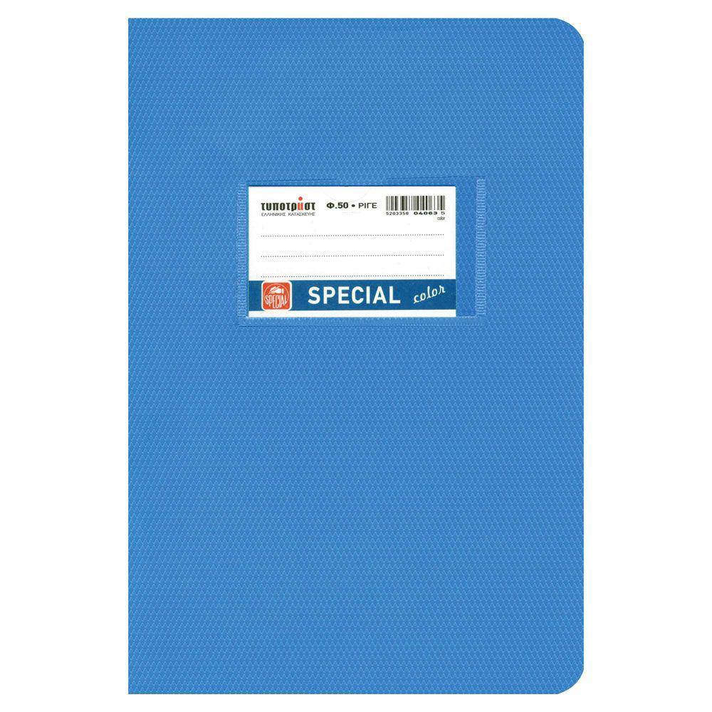 Κλασικό Special Τετράδιο 50 φύλλων, διάστασης B5 (17×25) με χρωματιστό ανάγλυφο πλαστικό εξώφυλλο. Τα φύλλα είναι από εξαιρετικής ποιότητας χαρτί 70γρ. και η γραμμογράφηση είναι ριγέ με σωστές αποστάσεις. Έχει στρογγυλεμένες γωνίες και προεκτυπωμένη ετικέτα 2 όψεων σε ματ χαρτί η οποία βγαίνει εύκολα χάρη στην εγκοπή. Διατίθεται σε 13 χρώματα (μαύρο, κόκκινο, πράσινο, μωβ, κίτρινο, πορτοκαλί, λαχανί, φούξια, γαλάζιο, γκρι, βεραμάν, μπορντώ, λευκό).