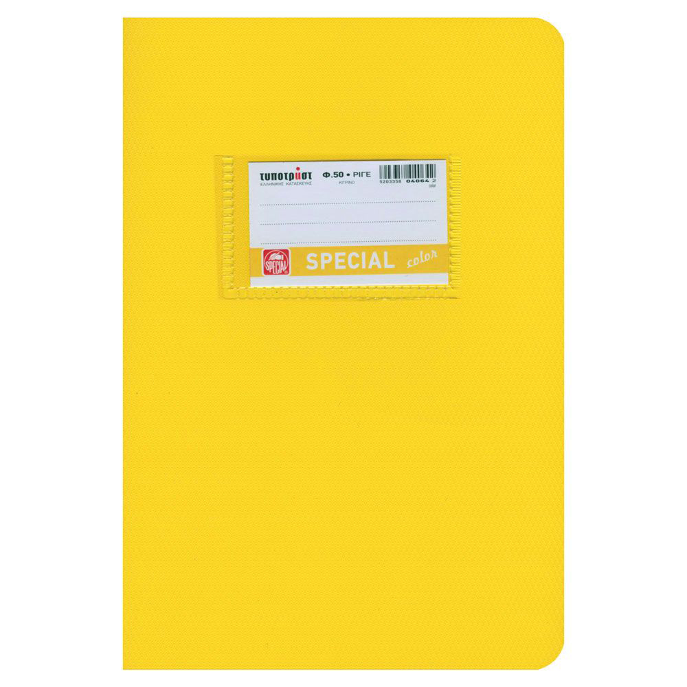 Κλασικό Special Τετράδιο 50 φύλλων, διάστασης B5 (17×25) με χρωματιστό ανάγλυφο πλαστικό εξώφυλλο. Τα φύλλα είναι από εξαιρετικής ποιότητας χαρτί 70γρ. και η γραμμογράφηση είναι ριγέ με σωστές αποστάσεις. Έχει στρογγυλεμένες γωνίες και προεκτυπωμένη ετικέτα 2 όψεων σε ματ χαρτί η οποία βγαίνει εύκολα χάρη στην εγκοπή. Διατίθεται σε 13 χρώματα (μαύρο, κόκκινο, πράσινο, μωβ, κίτρινο, πορτοκαλί, λαχανί, φούξια, γαλάζιο, γκρι, βεραμάν, μπορντώ, λευκό).