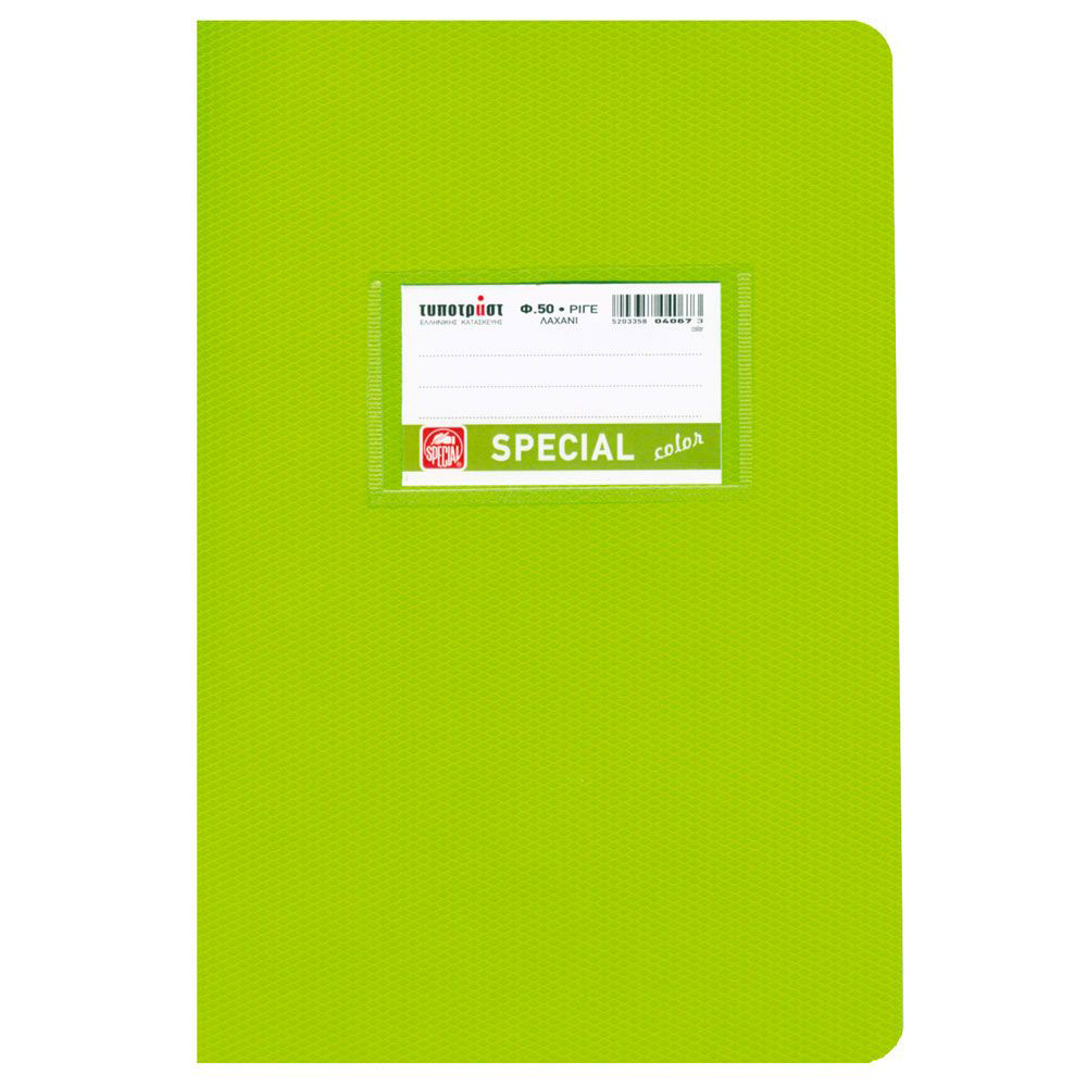 Κλασικό Special Τετράδιο 50 φύλλων, διάστασης B5 (17×25) με χρωματιστό ανάγλυφο πλαστικό εξώφυλλο. Τα φύλλα είναι από εξαιρετικής ποιότητας χαρτί 70γρ. και η γραμμογράφηση είναι ριγέ με σωστές αποστάσεις. Έχει στρογγυλεμένες γωνίες και προεκτυπωμένη ετικέτα 2 όψεων σε ματ χαρτί η οποία βγαίνει εύκολα χάρη στην εγκοπή. Διατίθεται σε 13 χρώματα (μαύρο, κόκκινο, πράσινο, μωβ, κίτρινο, πορτοκαλί, λαχανί, φούξια, γαλάζιο, γκρι, βεραμάν, μπορντώ, λευκό).