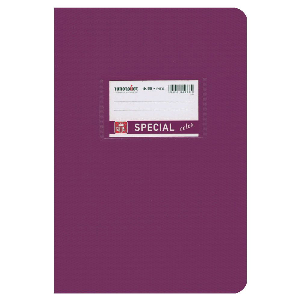 Κλασικό Special Τετράδιο 50 φύλλων, διάστασης B5 (17×25) με χρωματιστό ανάγλυφο πλαστικό εξώφυλλο. Τα φύλλα είναι από εξαιρετικής ποιότητας χαρτί 70γρ. και η γραμμογράφηση είναι ριγέ με σωστές αποστάσεις. Έχει στρογγυλεμένες γωνίες και προεκτυπωμένη ετικέτα 2 όψεων σε ματ χαρτί η οποία βγαίνει εύκολα χάρη στην εγκοπή. Διατίθεται σε 13 χρώματα (μαύρο, κόκκινο, πράσινο, μωβ, κίτρινο, πορτοκαλί, λαχανί, φούξια, γαλάζιο, γκρι, βεραμάν, μπορντώ, λευκό).