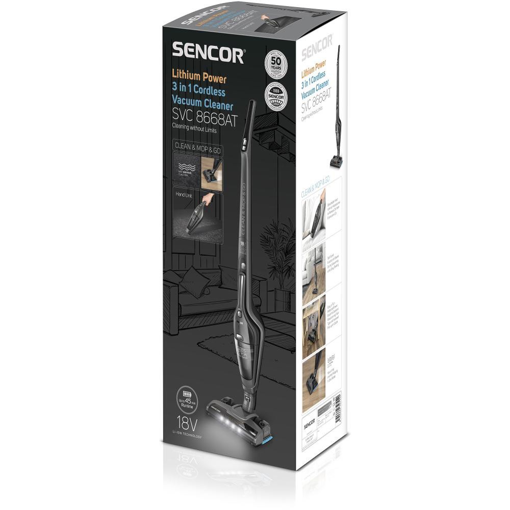 Η σκούπα stick 3-σε-1 με σφουγγαρίστρα Sencor SVC 8668AT σκουπίζει και σφουγγαρίζει σκληρά δάπεδα ταυτόχρονα, προσφέροντας γρήγορο και αποτελεσματικό καθαρισμό. Διαθέτει σύντομο χρόνο φόρτισης 4-6 ωρών και μεγάλο χρόνο λειτουργίας έως 45 λεπτά. Το σύστημα κυκλωνικής φιλτράρισης HEPA εξασφαλίζει σταθερή ισχύ αναρρόφησης, ενώ η περιστρεφόμενη βούρτσα με δικό της μοτέρ εγγυάται άριστα αποτελέσματα σε κάθε τύπο δαπέδου. Το ακροφύσιο με φωτισμό LED βοηθά στην ανίχνευση της σκόνης και διευκολύνει τον καθαρισμό σε σκοτεινά σημεία. Η περιστρεφόμενη κεφαλή 180° προσφέρει εύκολο χειρισμό και ελιγμούς γύρω από εμπόδια. Διαθέτει δύο επίπεδα ισχύος, υψηλής ισχύος για εντατικό καθαρισμό και κανονικής ισχύος για καθημερινή χρήση. Η τεχνολογία χωρίς σακούλα έχει δοχείο σκόνης χωρητικότητας 0,5 λίτρων. Η βάση φόρτισης εξασφαλίζει πρακτική αποθήκευση με ενσωματωμένη λειτουργία φόρτισης και θέση για αξεσουάρ. Η μπαταρία Li-Ion 2.200 mAh με τάση 18 V διαθέτει ένδειξη κατάστασης φόρτισης μέσω LED. Το επίπεδο θορύβου είναι 78 dB, και το βάρος της είναι 2,3 κιλά. Στη συσκευασία περιλαμβάνονται η σκούπα stick με φορητή μονάδα, βάση φόρτισης, αντάπτορας ρεύματος, εξάρτημα σφουγγαρίστρας, 5 υφασμάτινα πανάκια σφουγγαρίσματος, ακροφύσιο για γωνίες και βούρτσα σκόνης.