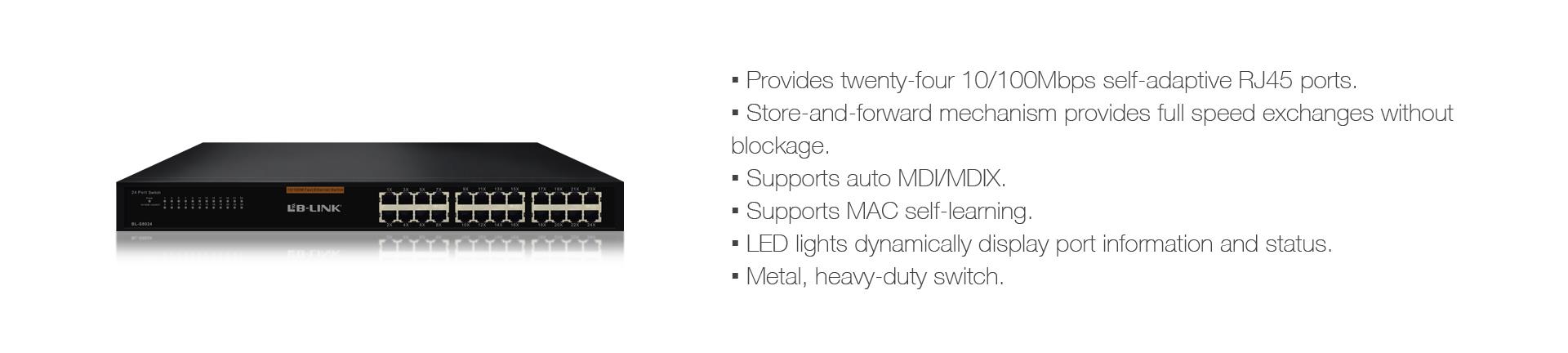 Provides twenty-four 10/100Mbps self-adaptive RJ45 ports.