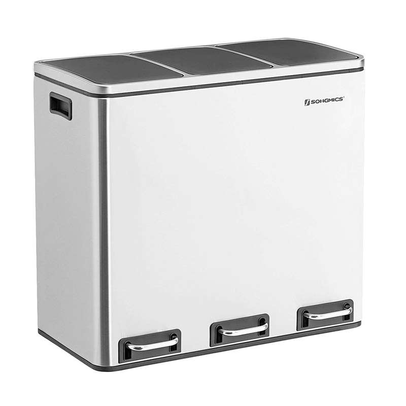 Ο κάδος απορριμμάτων, από την εταιρία Songmics, είναι κατασκευασμένος από ανοξείδωτο ατσάλι με πλαστική βάση. Είναι εξοπλισμένος με 3 αφαιρούμενα πλαστικά διαμερίσματα συνολικής χωρητικότητας 54 Lt (3 x 18 Lt). Είναι εφοδιασμένα με μεταλλικές λαβές μεταφοράς, για να μπορείτε να τα αδειάζετε ξεχωριστά. Επιπρόσθετα, κάθε διαμέρισμα διαθέτει μηχανισμό με αντιολισθητικό πεντάλ, ώστε η απόρριψη των απορριμμάτων να πραγματοποιείται με απολύτως άνετο και υγιεινό τρόπο.