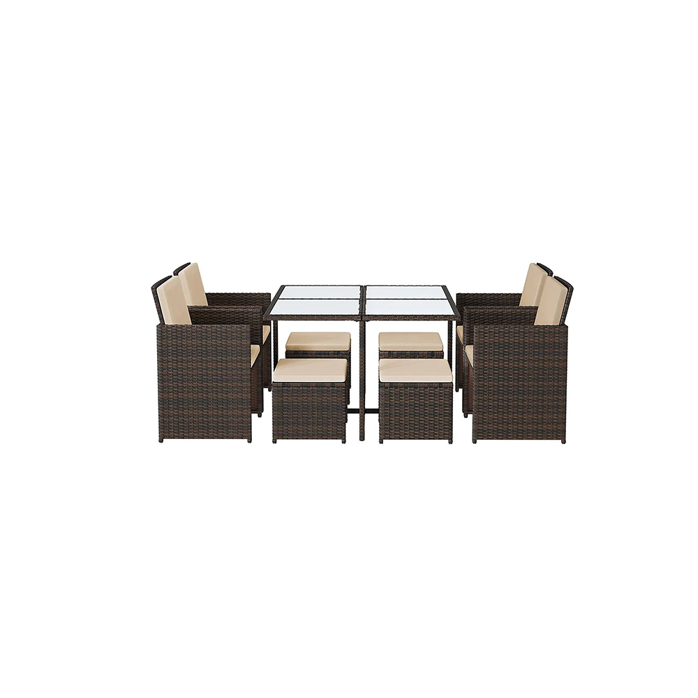 Έπιπλα κήπου 9 τεμαχίων. Υλικά επίπλων: Πολυαιθυλένιο, ατσάλι με βαφή πούδρας, σκληρυμένο γυαλί. Υλικά μαξιλαριών: VFT (Vertical Fiber Technology), κάλυμμα από πολυεστέρα.