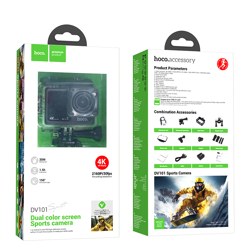 Η sports camera Hoco DV101 προσφέρει κορυφαία ποιότητα βίντεο με ανάλυση 2160p στα 30 καρέ ανά δευτερόλεπτο, ιδανική για την καταγραφή κάθε περιπέτειας με απόλυτη λεπτομέρεια. Διαθέτει διπλή οθόνη, μία μπροστινή και μία πίσω, που επιτρέπει εύκολο χειρισμό και έλεγχο της λήψης. Είναι αδιάβροχη μέχρι τα 30 μέτρα, ιδανική για καταδύσεις και δραστηριότητες στο νερό, ενώ η μπαταρία των 900mAh παρέχει έως 1.5 ώρα συνεχούς καταγραφής.