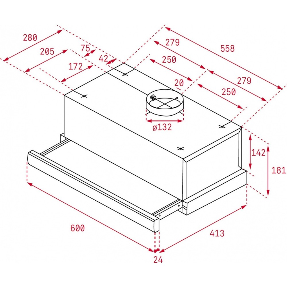 Διαθέτει μοτέρ με τουρμπίνα διπλής απορρόφησης και αυτόματη λειτουργία μοτέρ. 2 φίλτρα αλουμινίου, που πλένονται. Δυνατότητα χρήσης φίλτρων ενεργού άνθρακα. Επίπεδο θορύβου (dΒ): Μέγιστη ταχύτητα (LwA): 65 dB (*) Ελάχιστη ταχύτητα (LwA): 56 dB (*). Απορροφητική ικανότητα: Μέγιστη ταχύτητα: 304 m3/h (*) Ελάχιστη ταχύτητα: 160 m3/h (*) Ενεργειακή κλάση: D (*) σύμφωνα με ΕΕ 65/2014. Εσωτερικές διαστάσεις: Εσωτερικό ύψος (mm): 181 Εξωτερικές διαστάσεις: Ύψος (mm) : 181 Πλάτος (mm): 600 Βάθος (mm): 304-437 Βάρος (Κgs): 6,1 Ιδιαίτερα χαρακτηριστικά Πιστοποιητικά: CE; CB; Rohs Διάμετρος εξόδου Ø (mm): 120 Κατανάλωση εσωτερικού φωτισμού(W): 6 Πρίζα: Europlug Μήκος καλωδίου σύνδεσης (cm): 150 Ισχύς (V): 230 Συχνότητα (Hz): 50 Συνολική ισχύς πρόσβασης (W): 146 Ισχύς μοτέρ , (W): 130 Αξεσουάρ: Αντεπίστροφη βαλβίδα: Ναι Επέκταση εξόδου: no Προαιρετικά φίλτρα ενεργού άνθρακα: CNL 1C MADE IN PORTUGAL