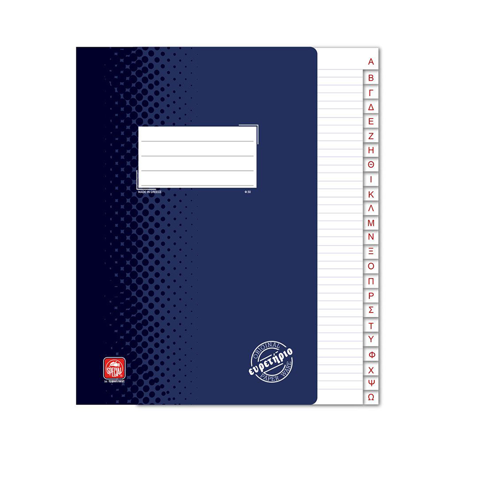 Χάρτινο ευρετήριο Ελληνικό. Έχει 48 λευκά φύλλα και η διάστασή του είναι Β5 (17×25) με στρογγυλεμένες γωνίες. Ιδανικό για καταχώρηση πελατών, ειδών και οργάνωση σημειώσεων.