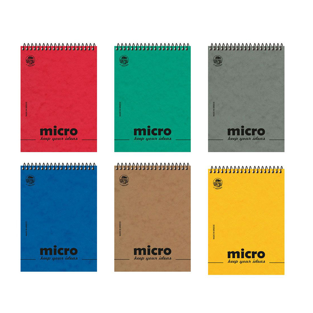 Μπλοκ Σπιράλ Ριγέ MICRO 80φ. Το σπιράλ σημειωματάριο Micro είναι πολύ πρακτικό χάρη στο μικρό του μέγεθος, το δέσιμο σπιράλ και τη ριγέ γραμμογράφηση που σας επιτρέπουν να κρατάτε άνετα τις απαραίτητες σημειώσεις! Κάθε σεμειωματάριο διαθέτει 80 φύλλα και σκληρό οπισθόφυλλο για να μπορείς να γράφεις σταθερά. Έχει 2 θέματα, εξώφυλλο από χαρτί Pressboard και διατίθεται σε πάκετο 12 τεμαχίων.
