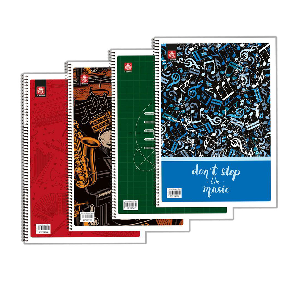 Τετράδιo Σπιράλ μουσικής με σχέδια. Εξώφυλλο χάρτινο πλαστικοποιημένο. Διάσταση Α4, 40 φύλλων, με 70gr χαρτί. Η γραμμογράφηση είναι 12 Πενταγράμμων. Η συσκευασία είναι ανάμεικτων σχεδίων σε πακέτο των 12τεμ.