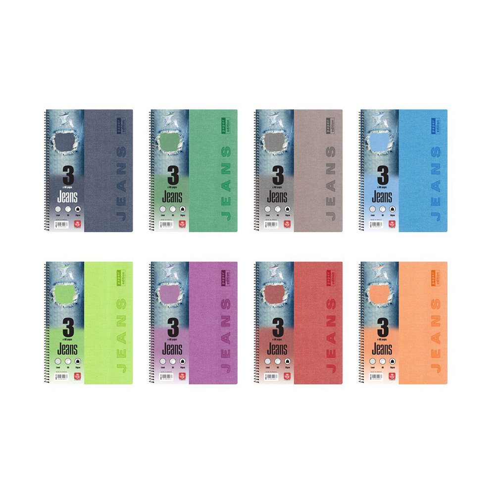 To αυθεντικό Jean Τετράδιο σπιράλ. Με εξώφυλλο τύπου “Denim” 350 γρ. που δίνει την αίσθηση υφάσματος και με σκληρό οπισθόφυλλο για να μπορείς να γράφεις σταθερά. Τα φύλλα είναι από εξαιρετικής ποιότητας χαρτί 70γρ. και η γραμμογράφηση είναι ριγέ με σωστές αποστάσεις. Έχουν διαχωριστικό για μεγαλύτερη ευκολία. Διατίθεται σε 8 χρώματα (κόκκινο, σκούρο μπλε, πράσινο, μωβ, γαλάζιο, πορτοκαλί, λαχανί, γκρι). Η συσκευασία είναι ανάμεικτων χρωμάτων (τυχαία επιλογή).