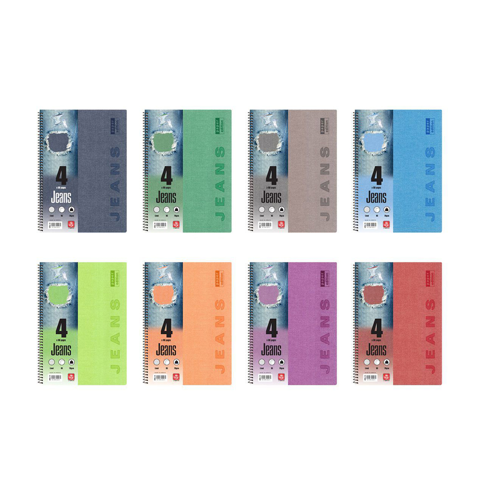 To αυθεντικό Jean Τετράδιο σπιράλ. Με εξώφυλλο τύπου “Denim” 350 γρ. που δίνει την αίσθηση υφάσματος και με σκληρό οπισθόφυλλο για να μπορείς να γράφεις σταθερά. Τα φύλλα είναι από εξαιρετικής ποιότητας χαρτί 70γρ. και η γραμμογράφηση είναι ριγέ με σωστές αποστάσεις. Έχουν διαχωριστικό για μεγαλύτερη ευκολία. Διατίθεται σε 8 χρώματα (κόκκινο, σκούρο μπλε, πράσινο, μωβ, γαλάζιο, πορτοκαλί, λαχανί, γκρι). Η συσκευασία είναι ανάμεικτων χρωμάτων (τυχαία επιλογή).