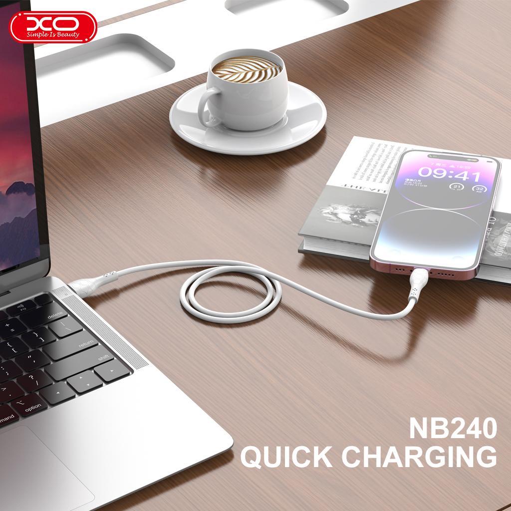 XO-NB240Cable length: 1M, weight: 20grCore: (pure copper 43/0.08BS*2C+16/0.08BS+250D/*2C) OD3.8 PVC covered with PCV anti-silica gel (2.4A)Function: charging + data (480Mbps)